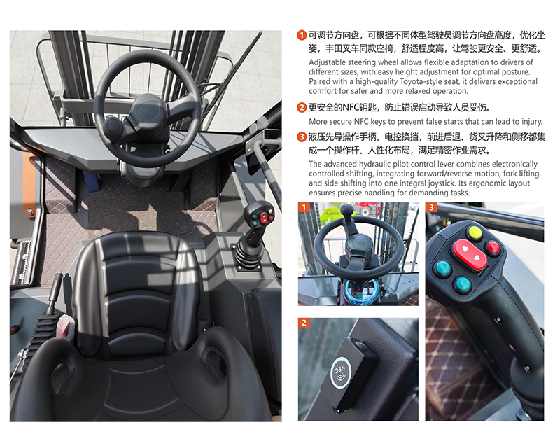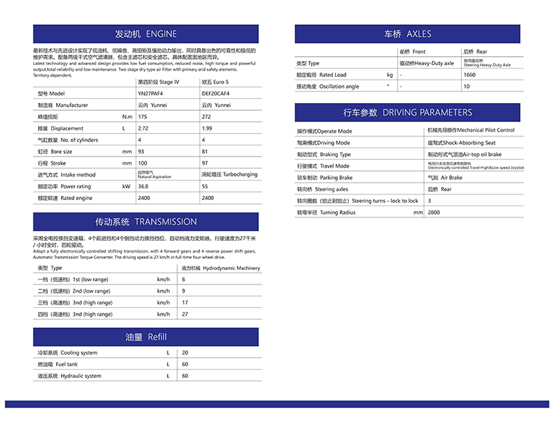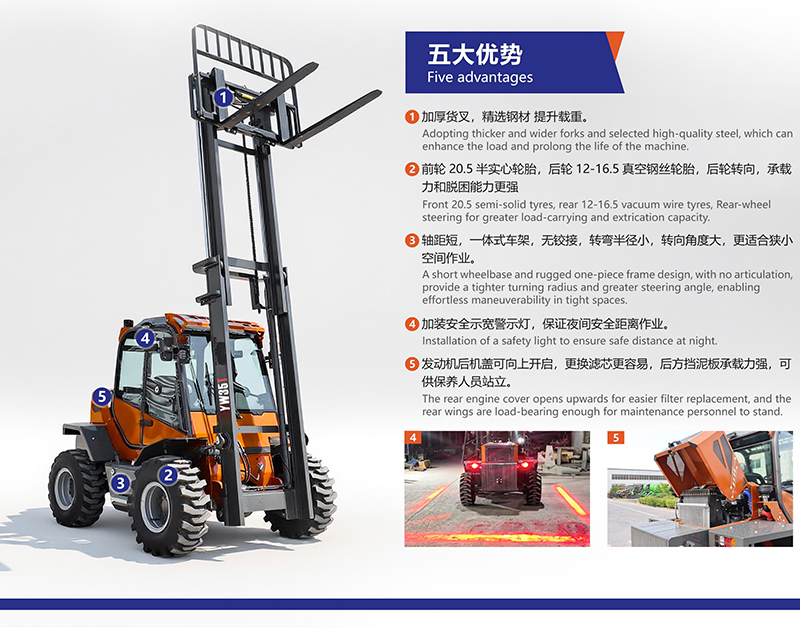 一体式越野叉车(YW35T)为加厚货叉,精选钢材提升载重,前轮20.5半实心轮胎,后轮12-16.5真空钢丝轮胎,后轮转向,承载 力和脱困能力更强,轴距短,一体式车架,无铰接,转弯半径小,转向角度大,更适合狭小 空间作业,加装安全示宽警示灯,保证夜间安全距离作业,发动机后机盖可向上开启,更换滤芯更容易,后方挡泥板承载力强,可 供保养人员站立。